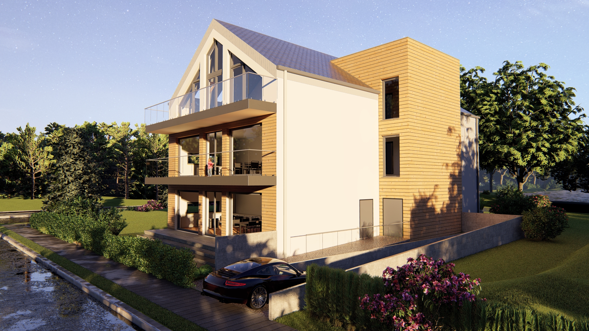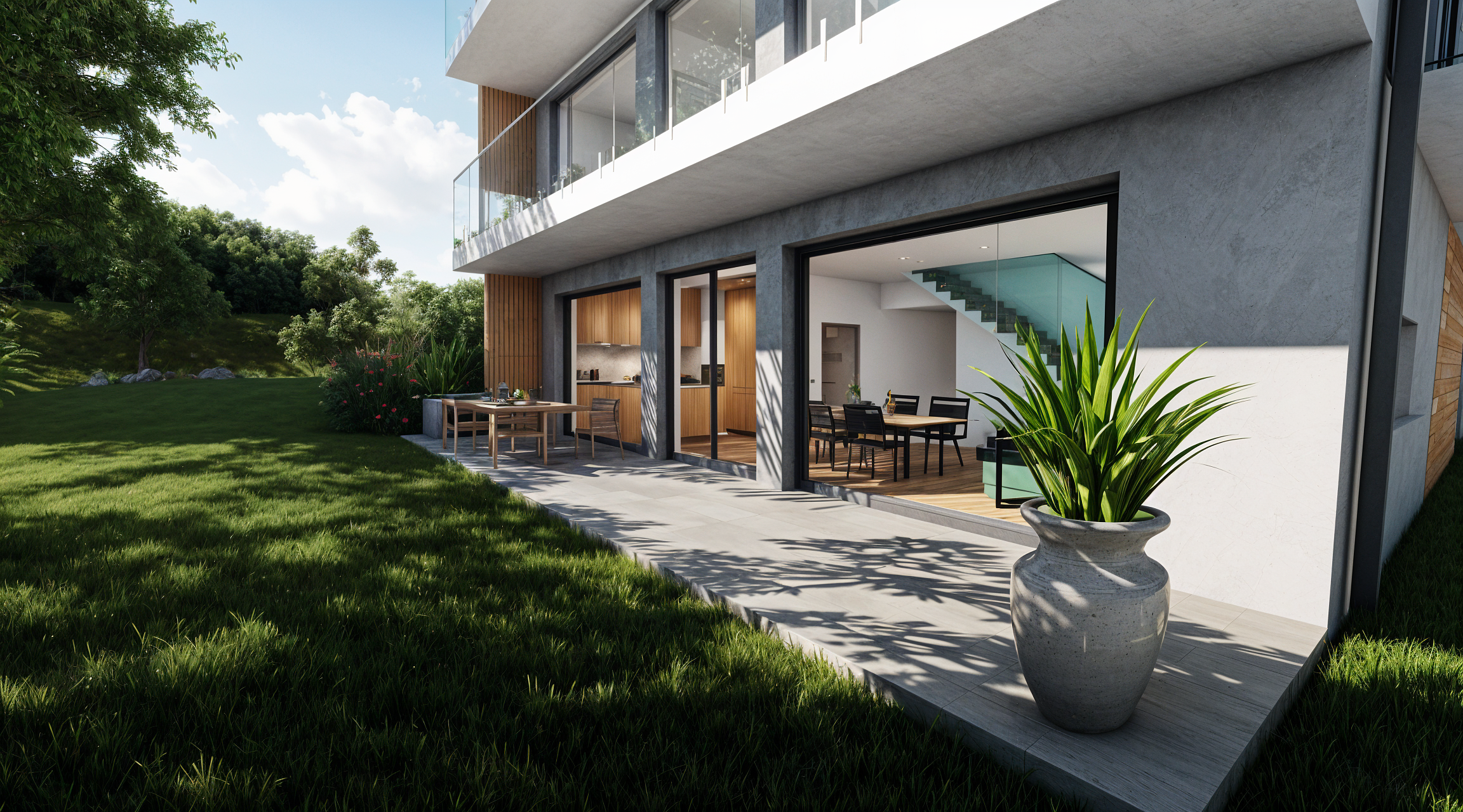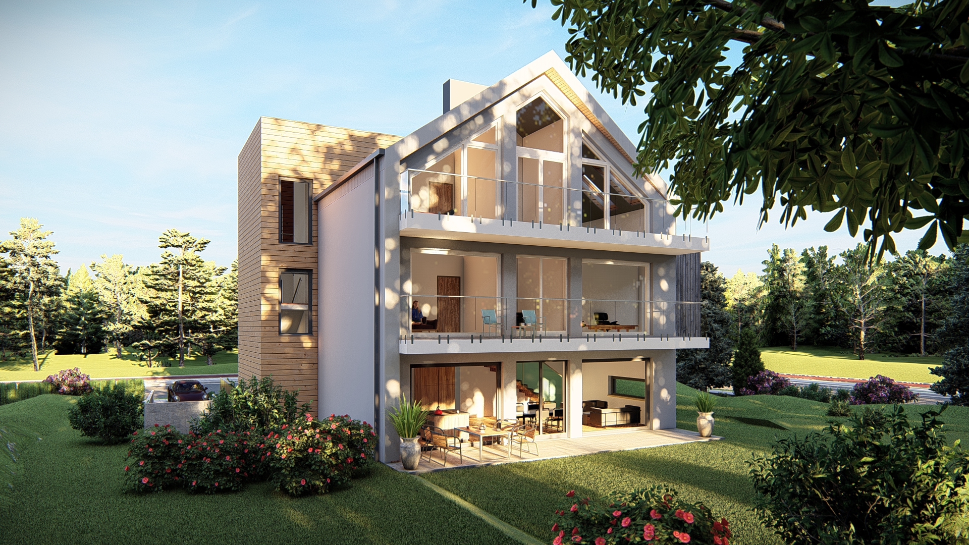 Główne założenie – uzyskać przestronne mieszkania w rezydencjonalnej części miasta. Założenie zostało wykonane. Część podziemną – garażową – kryje taras zielony z uwagi na rygorystyczne wymagania odnośnie zachowania ilości terenów biologicznie czynnych.
