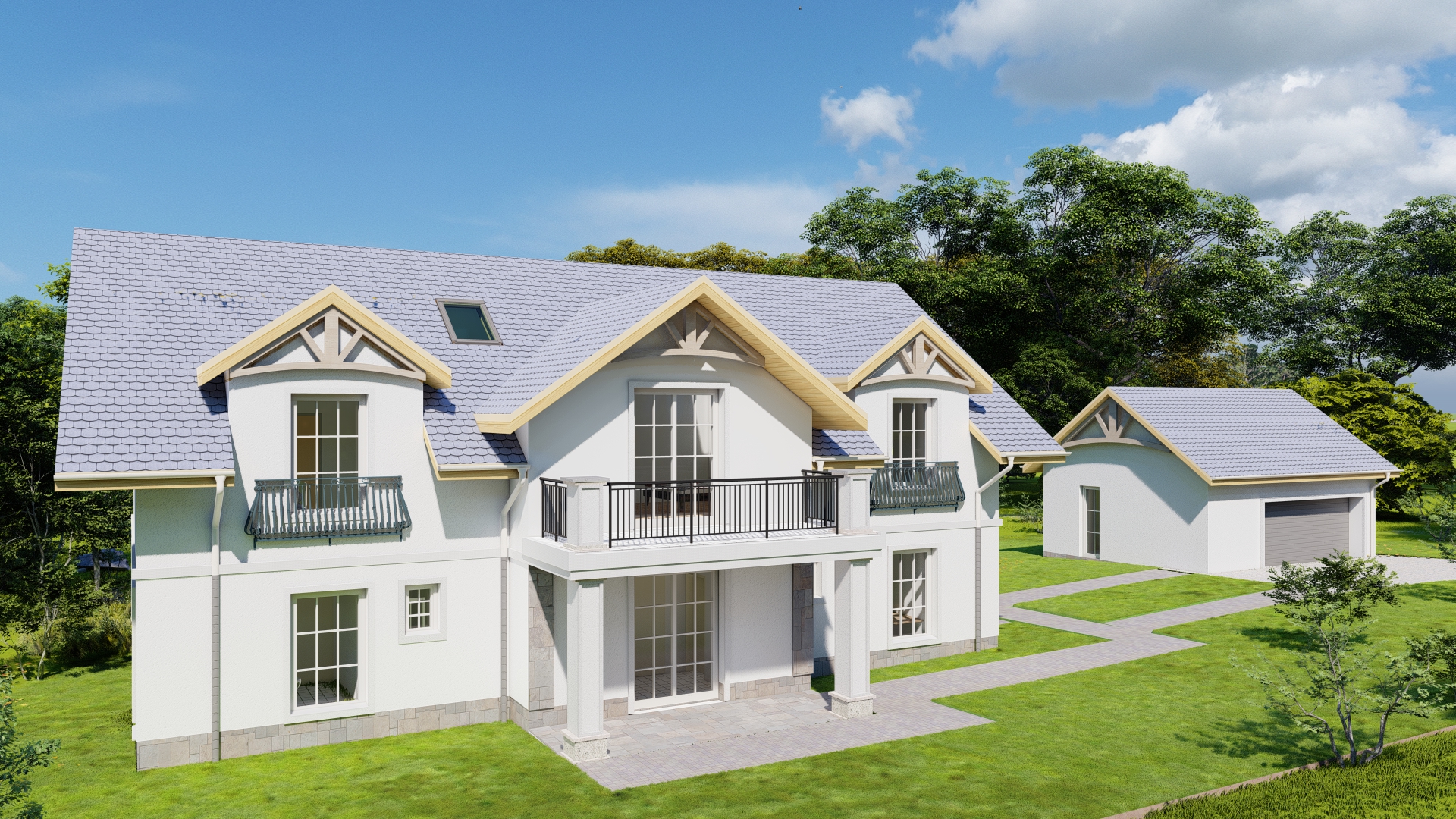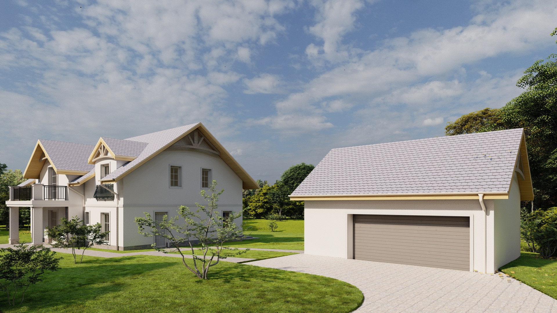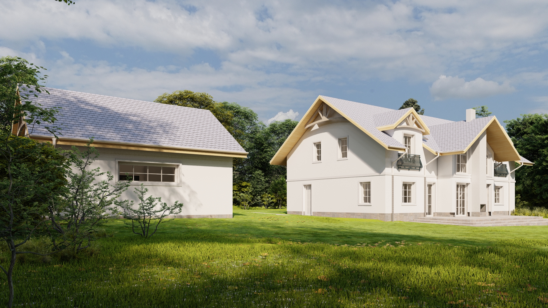 Budynek jednorodzinny na planie figury prostopadłościennej z dachem dwuspadowym o kącie nachylenia połaci zgodnej z MPZP wynoszącym 35o. Garaż wolnostojący na planie figury prostopadłościennej z dachem dwuspadowym o kącie nachylenia połaci zgodnej z MPZP wynoszącym 35o. Nawiązuje do otaczającej zabudowy i spełnia wymogi WZ w tym względzie. Bryła prostopadłościenna. Tynki w kolorze białym, dach grafitowy, rynny i rury spustowe w kolorze kremowym.
