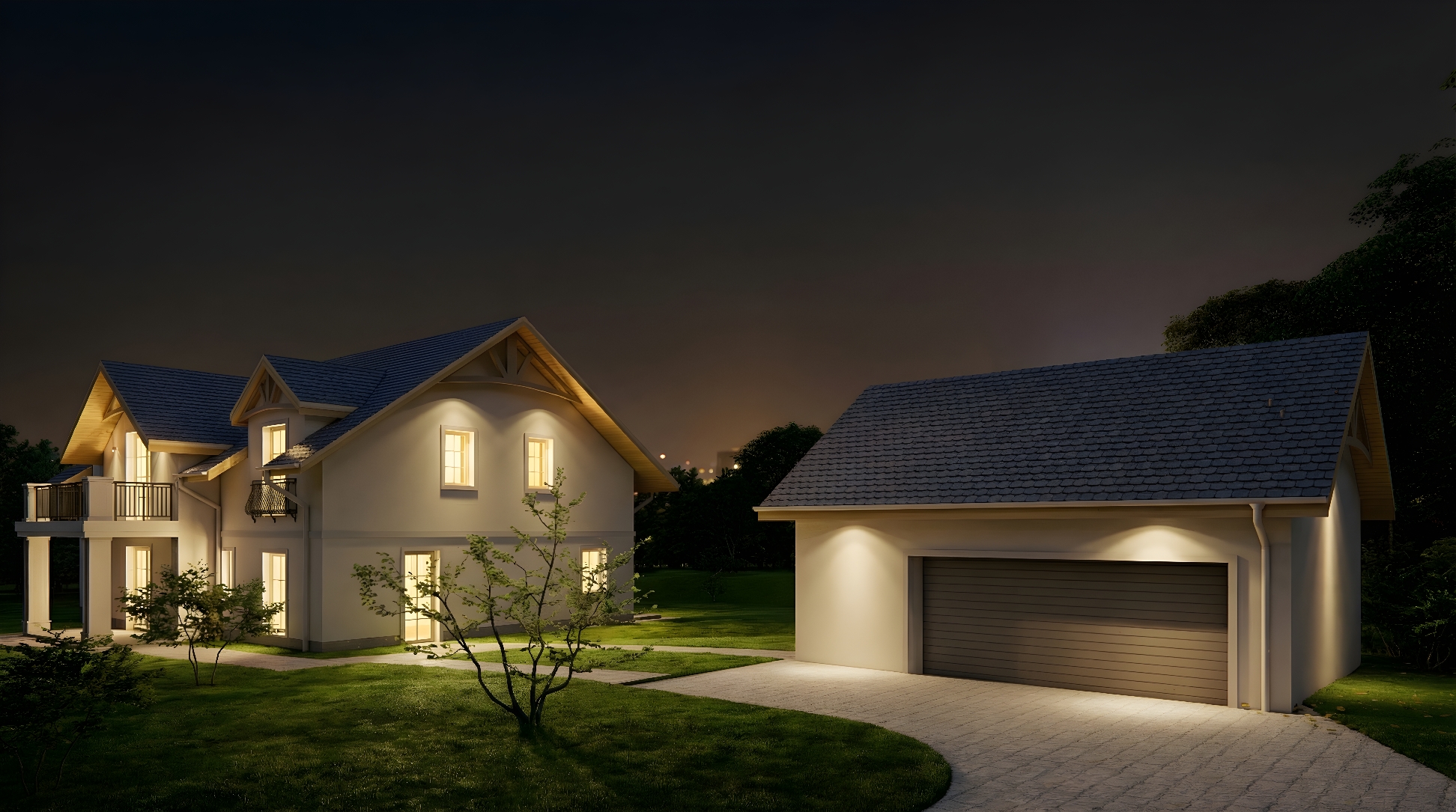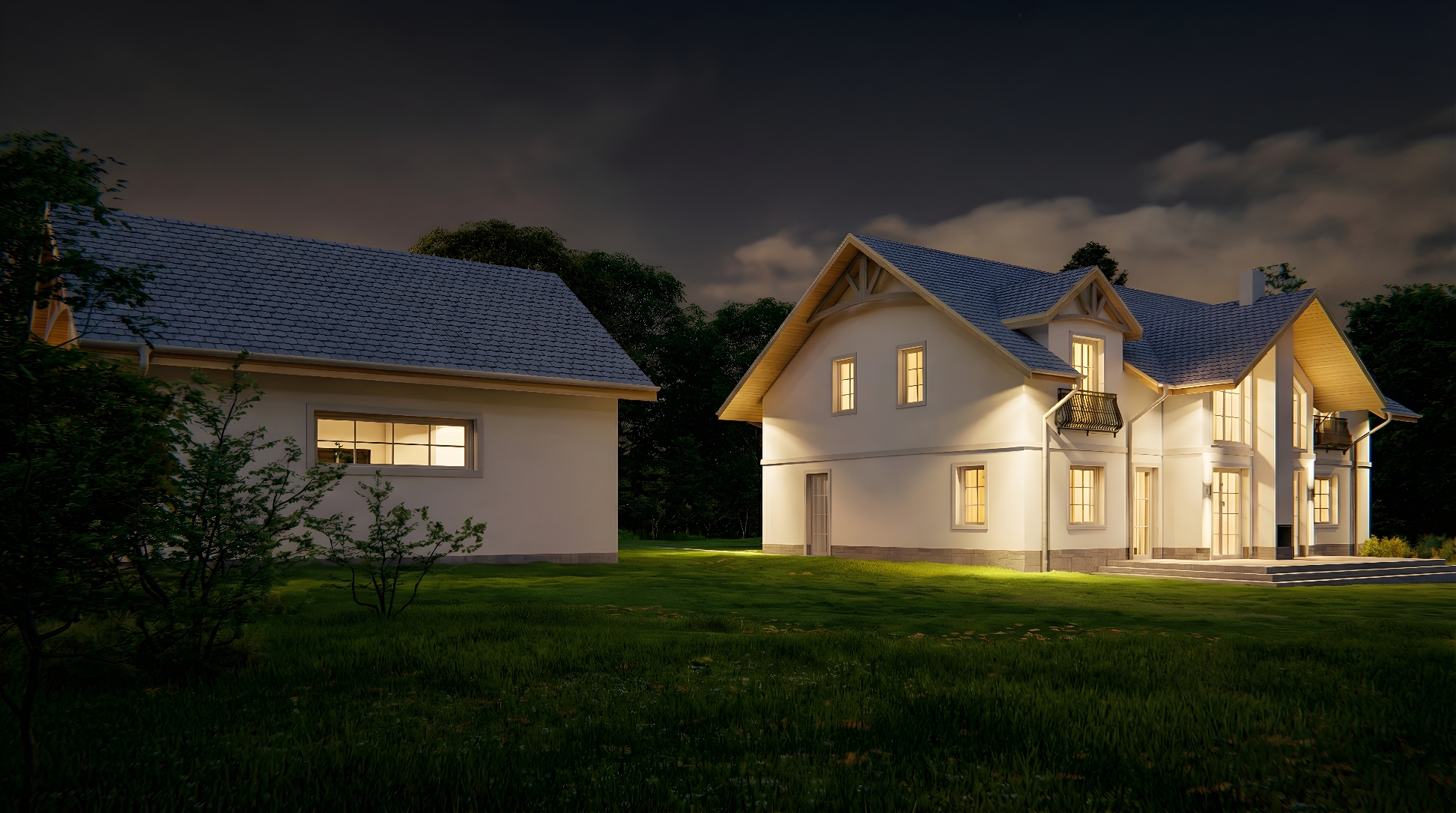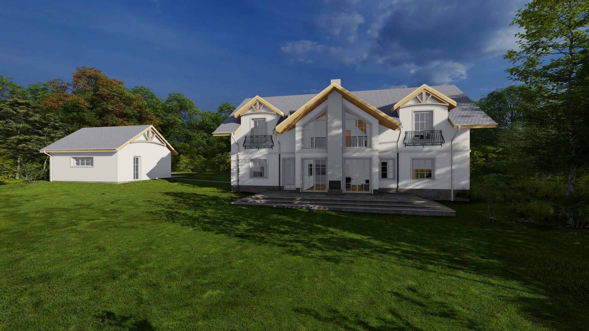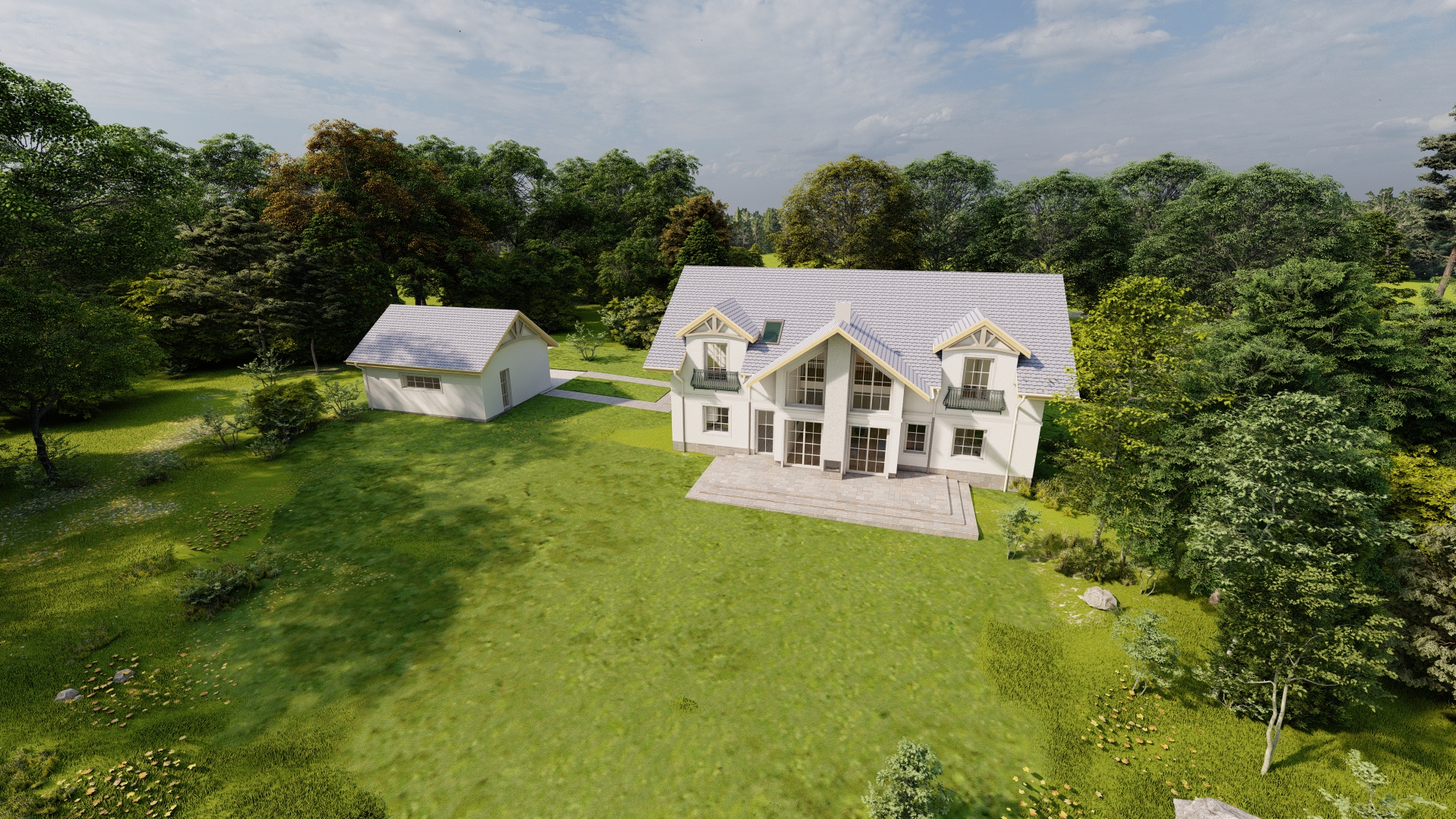 Budynek jednorodzinny na planie figury prostopadłościennej z dachem dwuspadowym o kącie nachylenia połaci zgodnej z MPZP wynoszącym 35o. Garaż wolnostojący na planie figury prostopadłościennej z dachem dwuspadowym o kącie nachylenia połaci zgodnej z MPZP wynoszącym 35o. Nawiązuje do otaczającej zabudowy i spełnia wymogi WZ w tym względzie. Bryła prostopadłościenna. Tynki w kolorze białym, dach grafitowy, rynny i rury spustowe w kolorze kremowym.