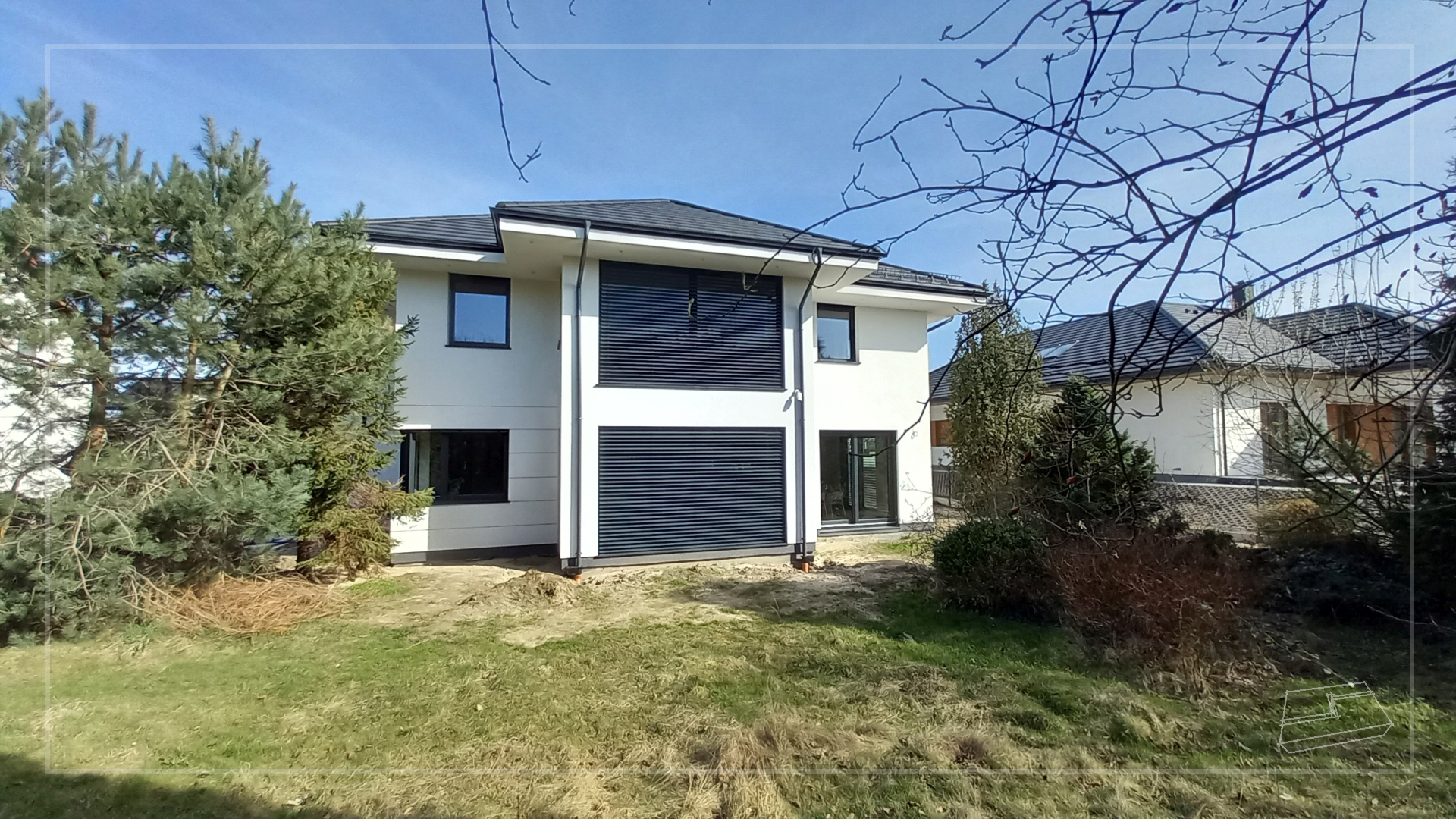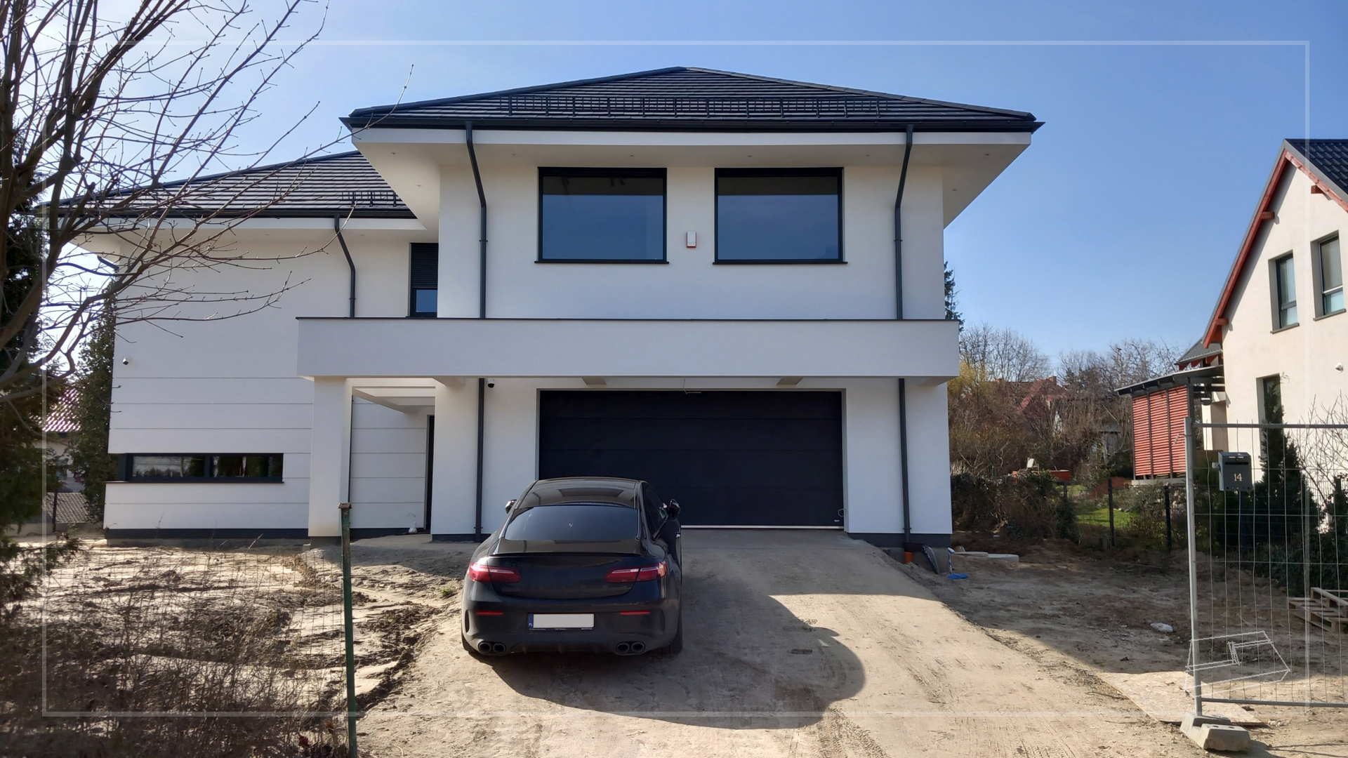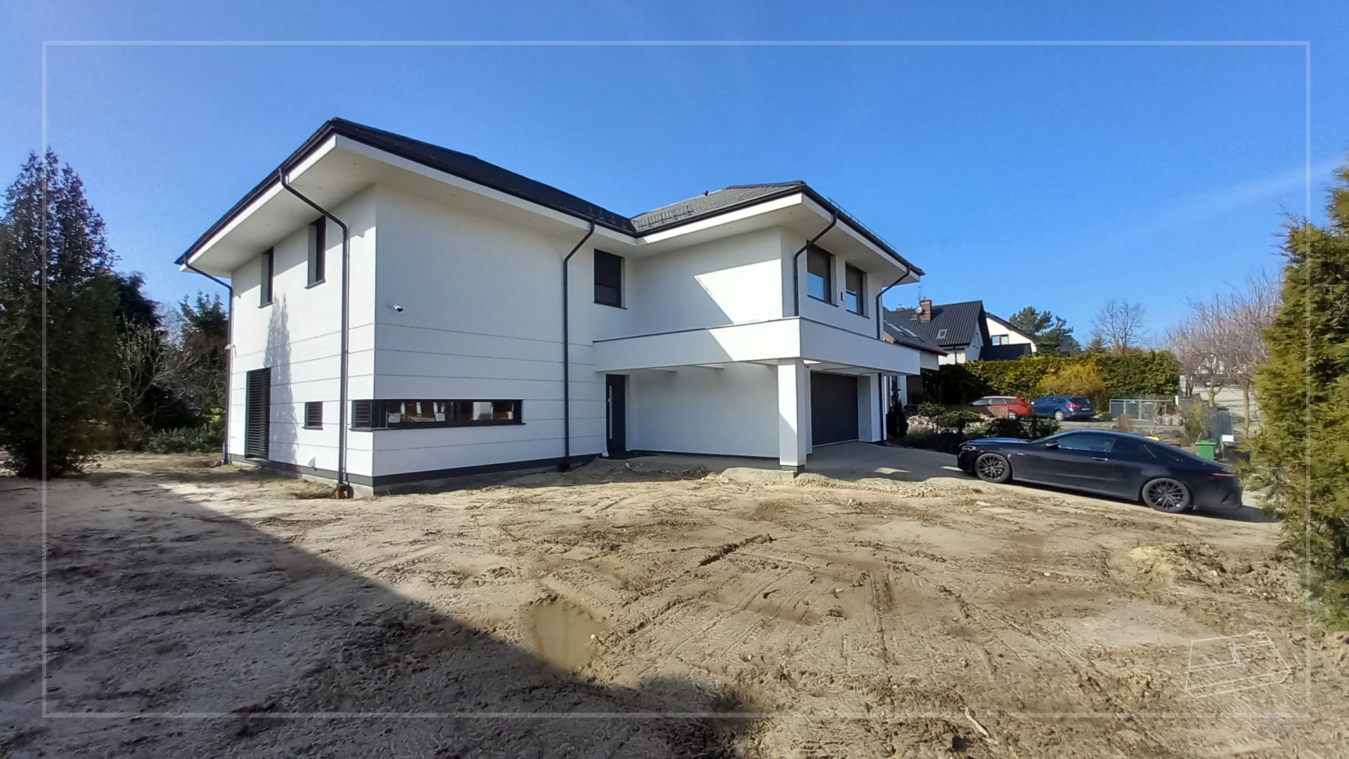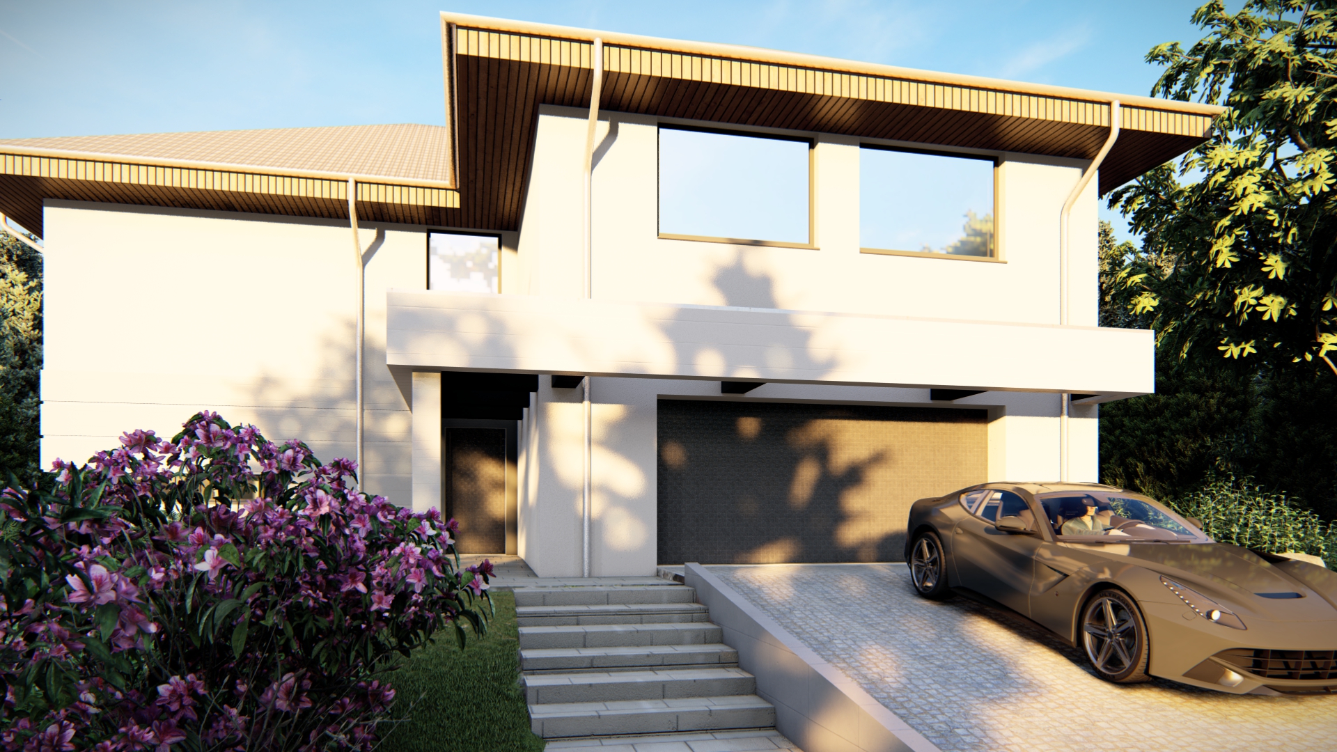 Budynek z garażem wbudowanym dwustanowiskowym, kuchnią, biurem na parterze i przestronnym salonem z reprezentacyjnymi schodami.