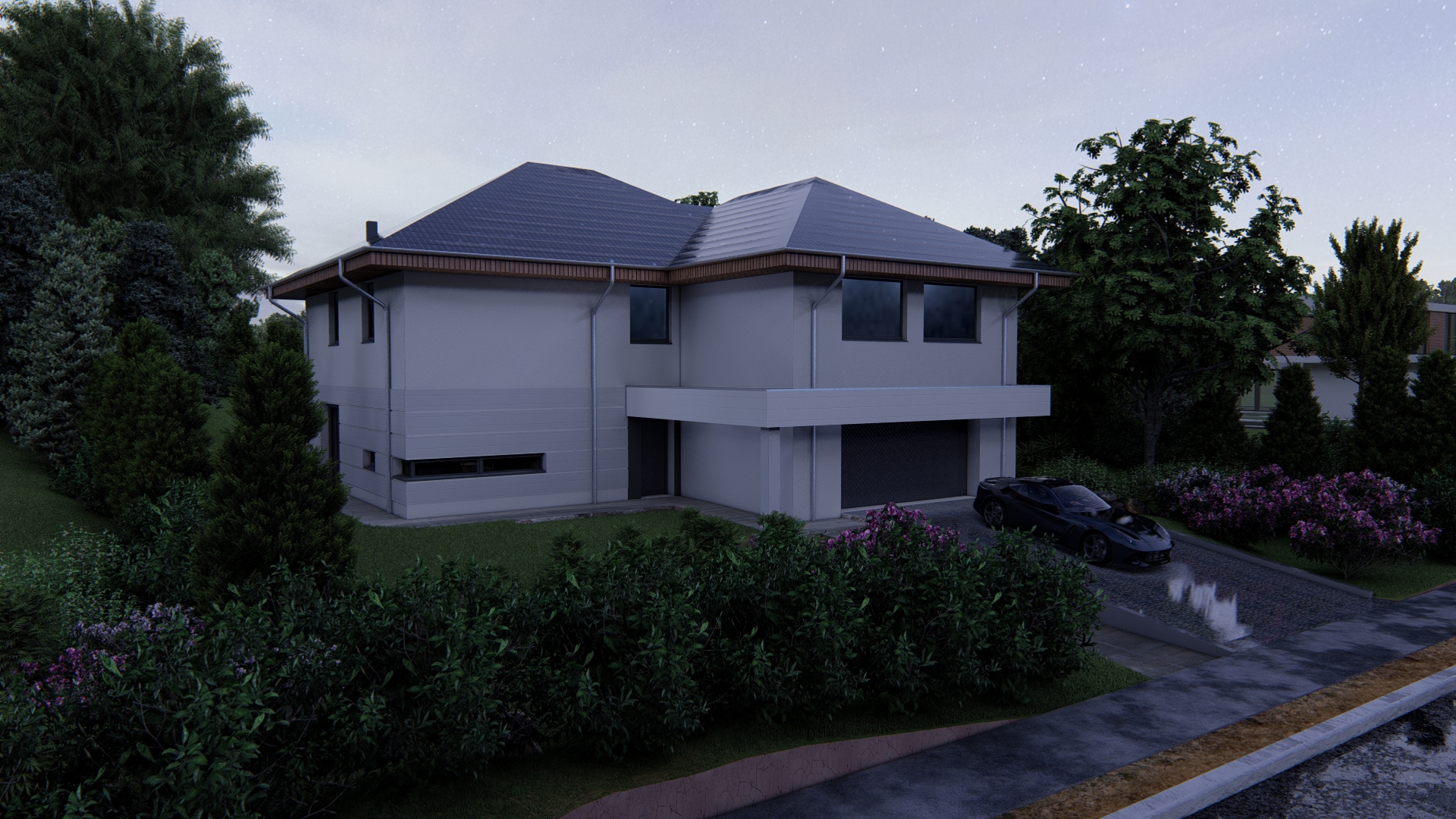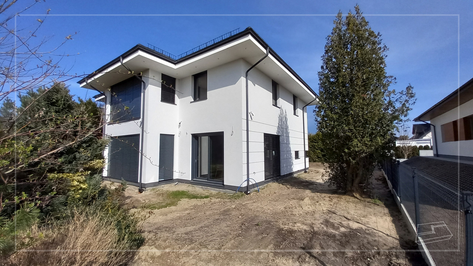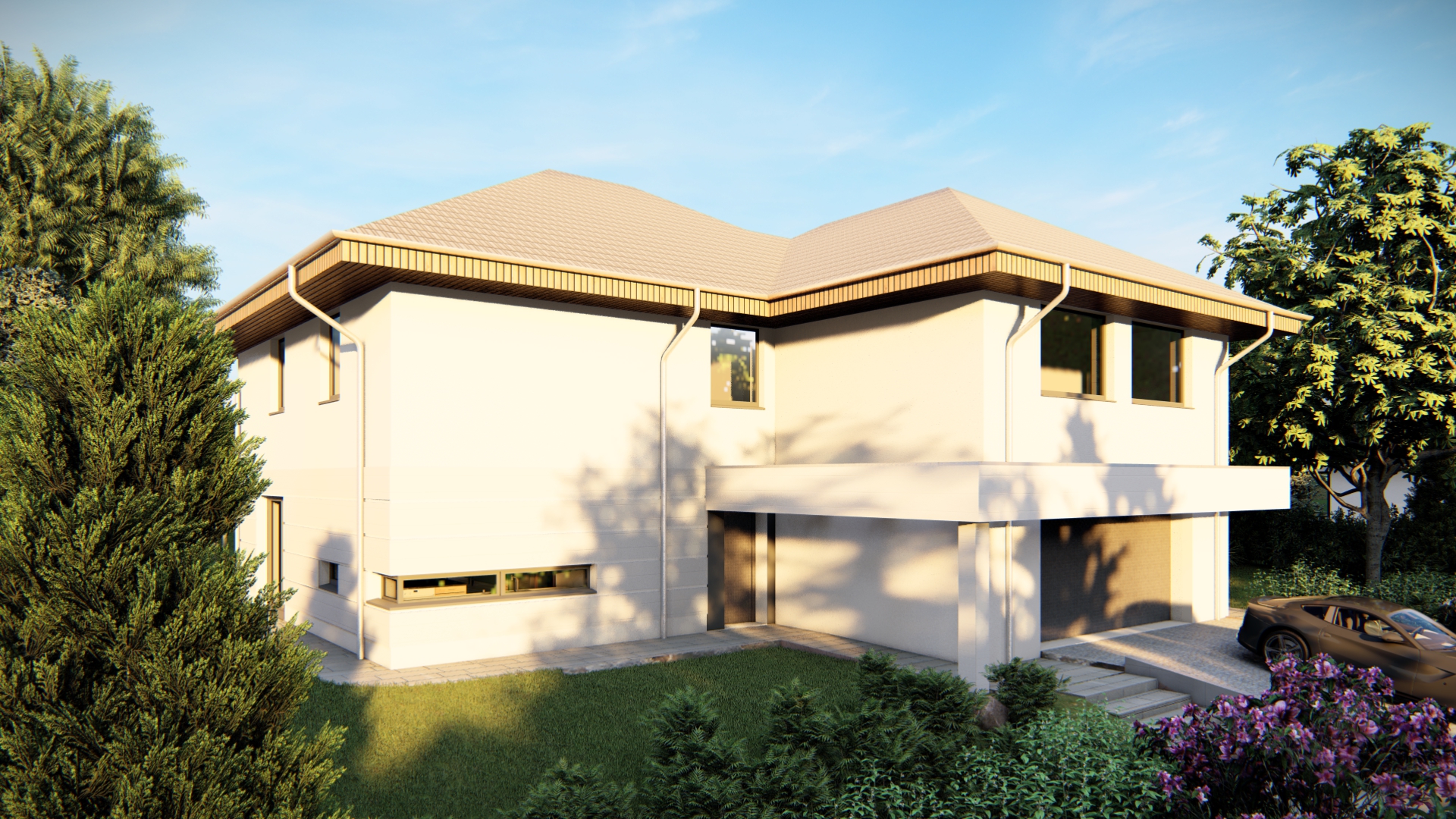 Budynek z garażem wbudowanym dwustanowiskowym, kuchnią, biurem na parterze i przestronnym salonem z reprezentacyjnymi schodami.