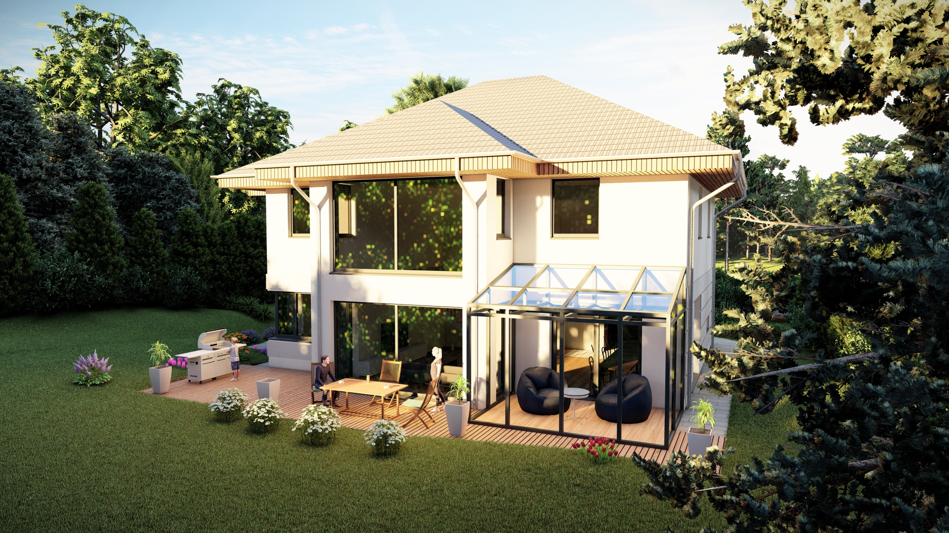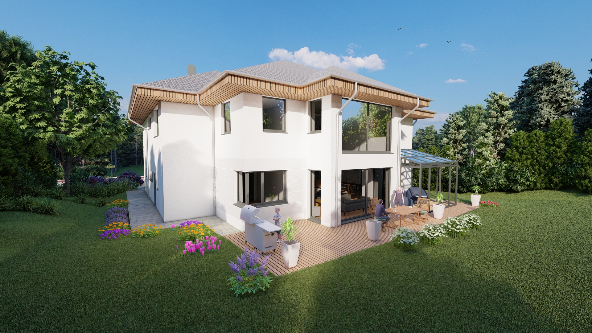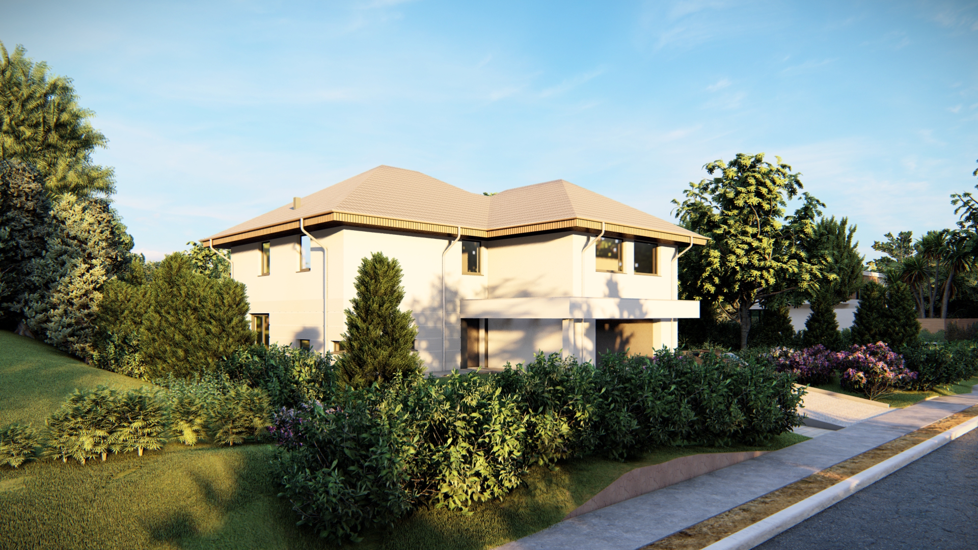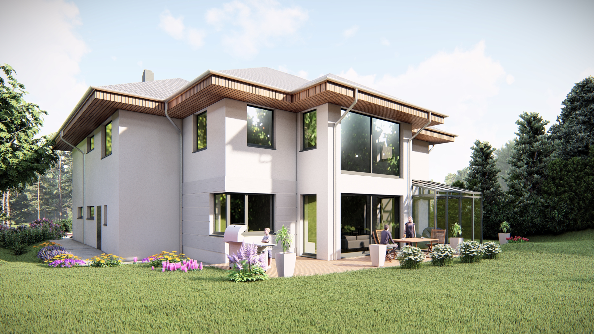 Budynek z garażem wbudowanym dwustanowiskowym, kuchnią, biurem na parterze i przestronnym salonem z reprezentacyjnymi schodami.